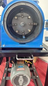 В бирюзовой модели между двигателем и камерой установлен регулируемый кронштейн, позволяющий изменять угол наклона камеры в зависимости от условий работы и типа материала, что улучшает траекторию движения частиц и повышает эффективность измельчения.